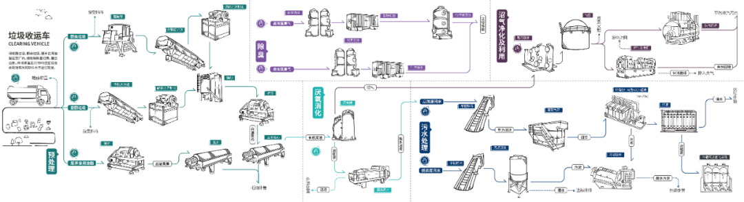 光明环境园项目采用行业主流的“预处理+厌氧发酵+沼气发电”处理工艺,辅助沼气净化系统、污水处理系统、沼渣干化系统、自动控制系统等,项目工艺全面且成熟稳定,其中利用发电余热进行沼渣干化、预处理杂质二次脱水及溴化锂空调余热利用等为行业创新。项目选择国际国内领先的系统集成商参与建设,并创新利用 Al技术提升工艺系统运行效率,打造覆盖全过程的智慧运营系统,力争在预处理筛分效率、厌氧产气率、臭气处理效果、资源化利用、安全管理等方面达到行业领先水平。
